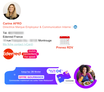 “Thanks to Letsignit, Edenred France is strengthening its corporate culture and equipping its sales force with an integrated communication system. Unified signatures, personalized banners, simplified appointment scheduling and automatic integration of vCards: each email sent becomes an engaging point of contact.” Carine Afro, Employer Brand & Internal Communication Director at Edenred France