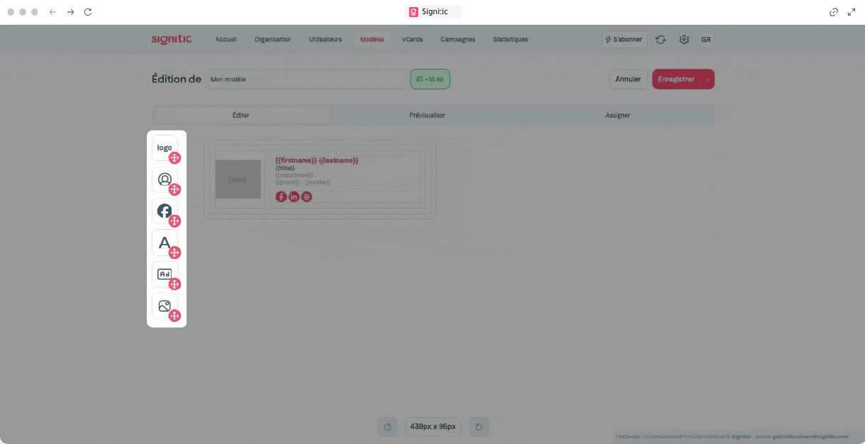 Creation sidePositive Signitic offers a drag & drop editor without a line of code. You build your templates visually, adjust the colors and typography, and it’s ready. Marketing teams keep control of the design without depending on a developer for each change.